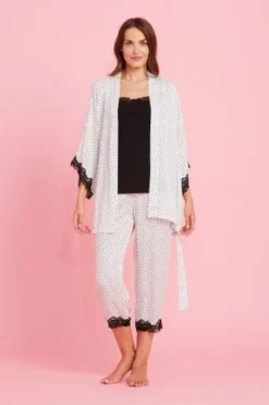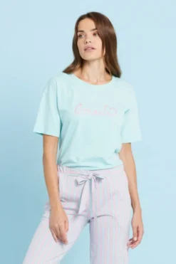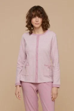 Pigiama donna caldo cotone berry con pantalone con stampa scozzese e top celeste con stampa