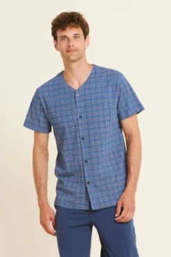 Pigiama uomo cotone righina top blu manica corta con abbottonatura serafino e taschino stampato, pantalone corto con stampa a righe