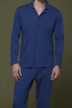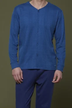 Pigiama uomo micropile pull pantaloni blu con polsino e top rosso con stampa pied de poule