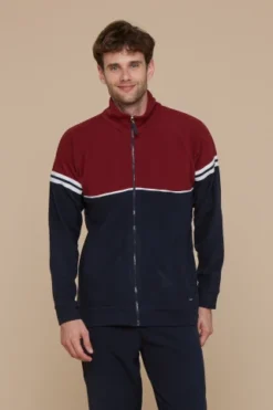 Pigiama uomo top eco-agnellino beige con ricamo e applicazione pantalone rosso micropile con polsino